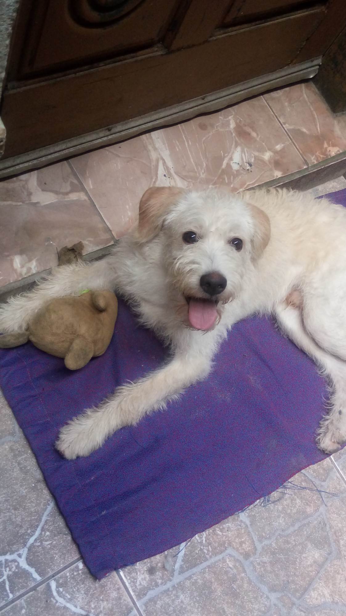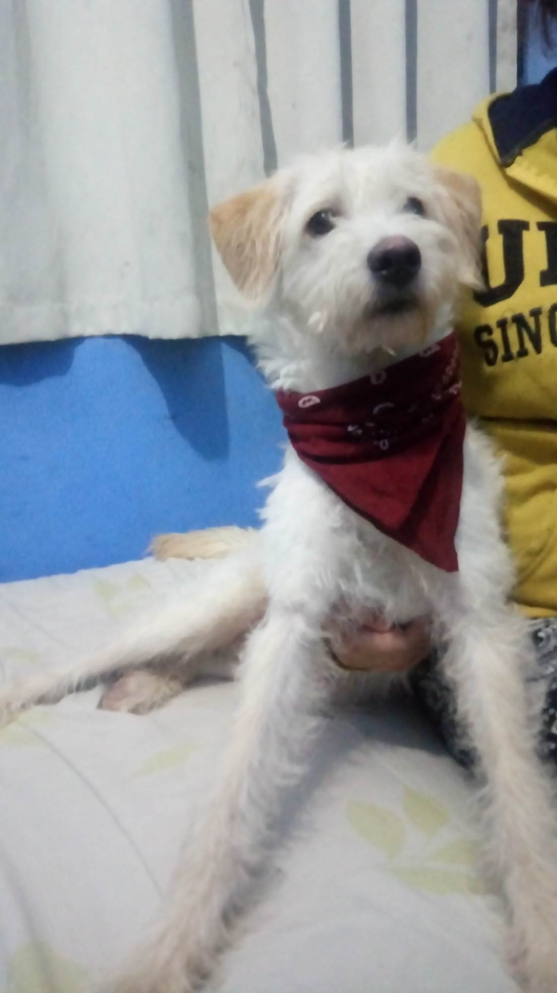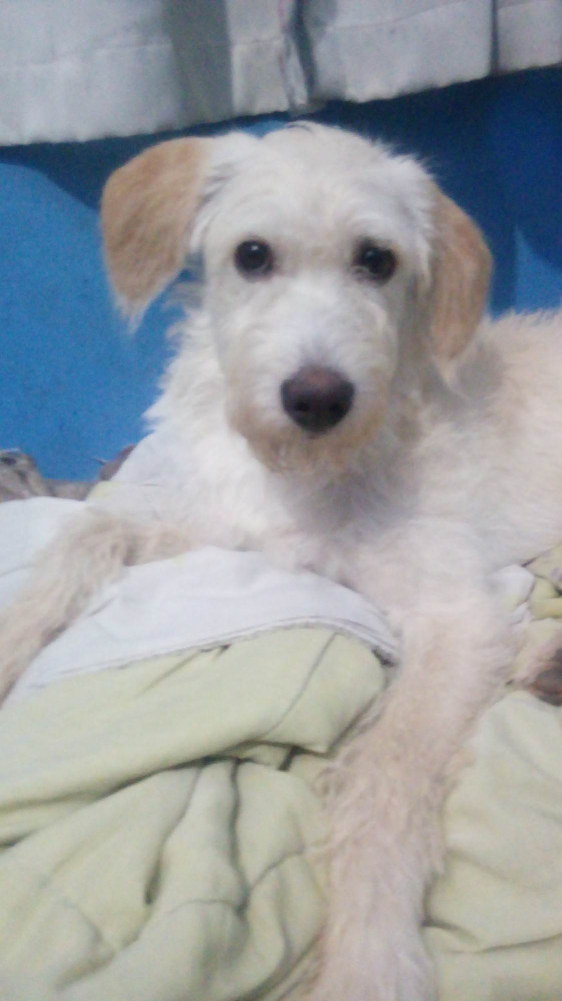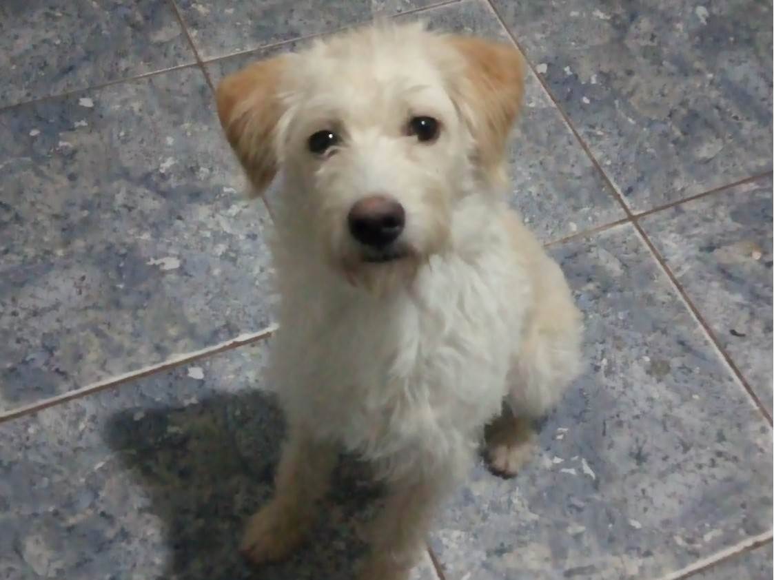 Cachorro médio, 4 anos, Mestiço de poodle, cor Branca amarelada .